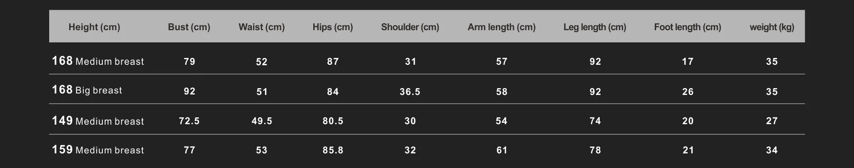 Height 149cm,159cm,168cm